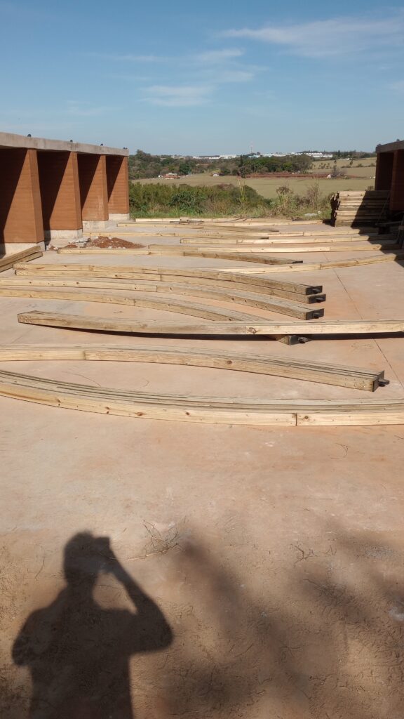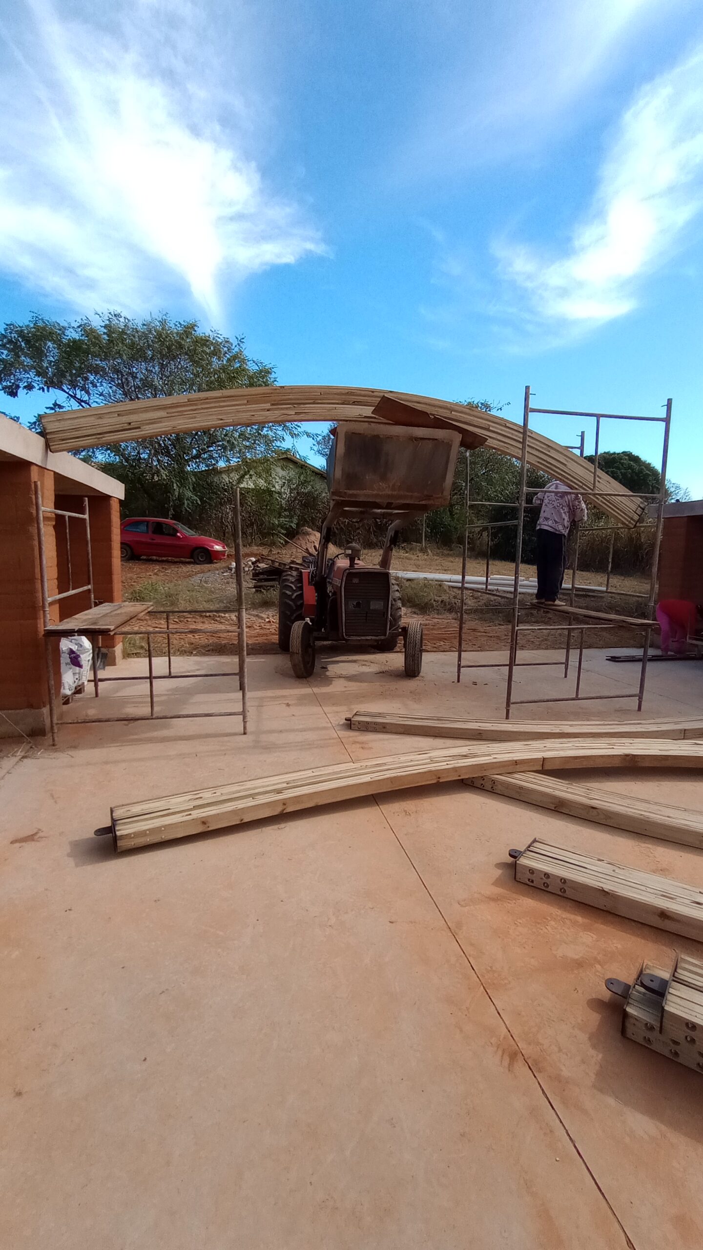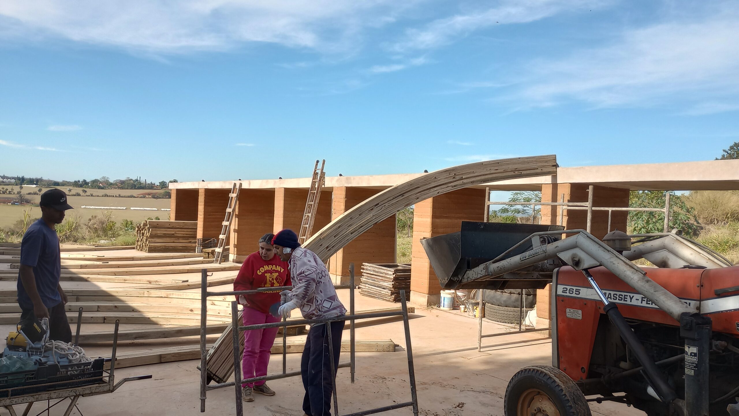 Começamos a montar o telhado do barracão. Foi um dia de decisões para encontrar a forma mais segura de fazer isso. Fomos devagar, apoiando em cada etapa, mas acho que pegamos o jeito.