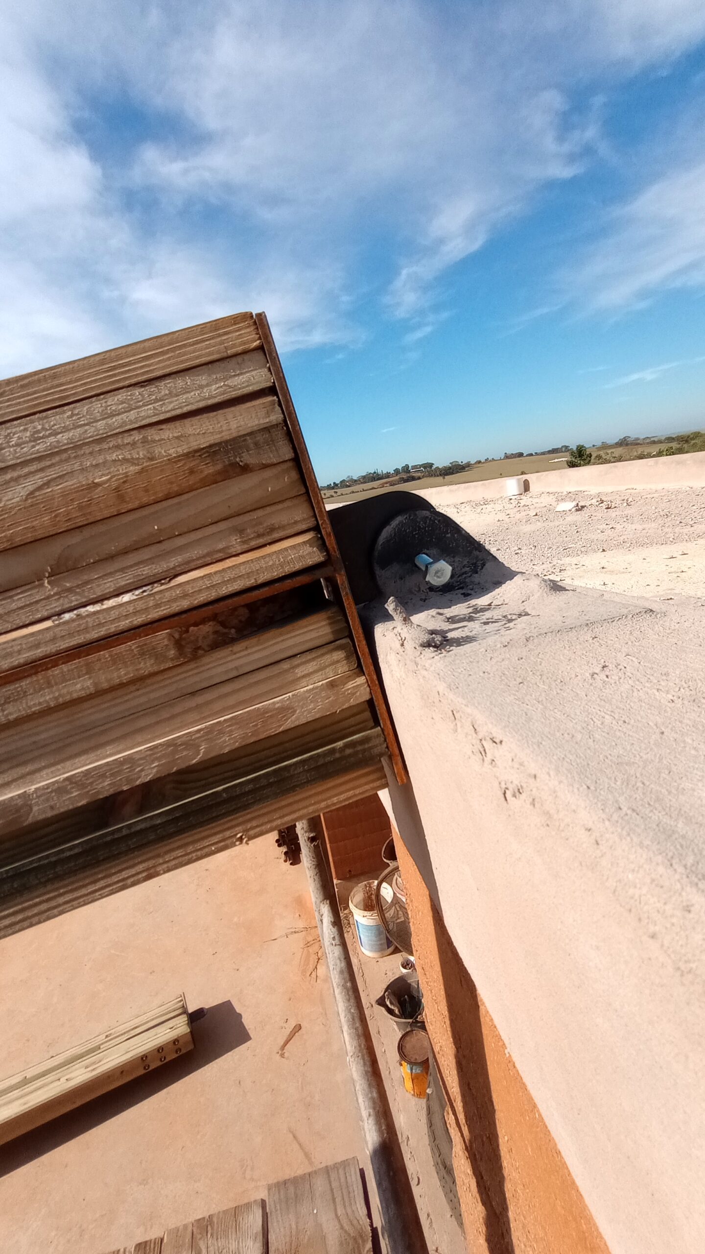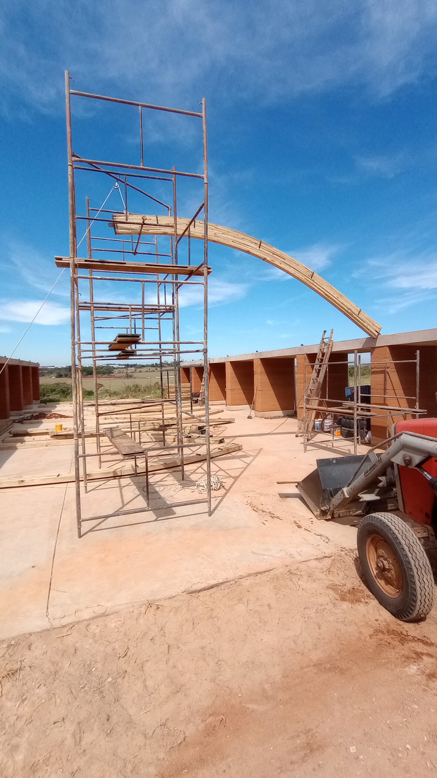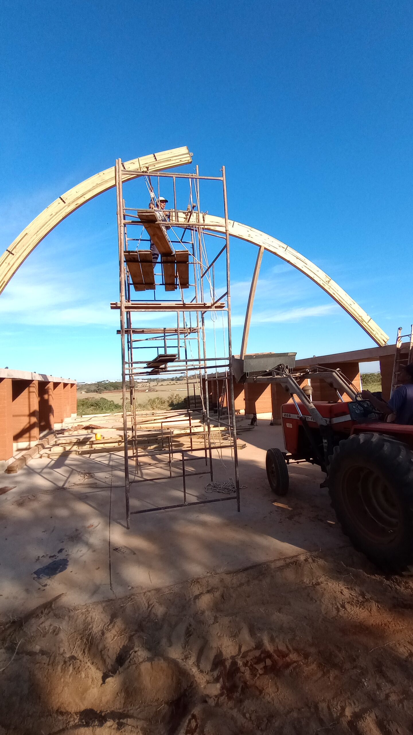 Começamos a montar o telhado do barracão. Foi um dia de decisões para encontrar a forma mais segura de fazer isso. Fomos devagar, apoiando em cada etapa, mas acho que pegamos o jeito.