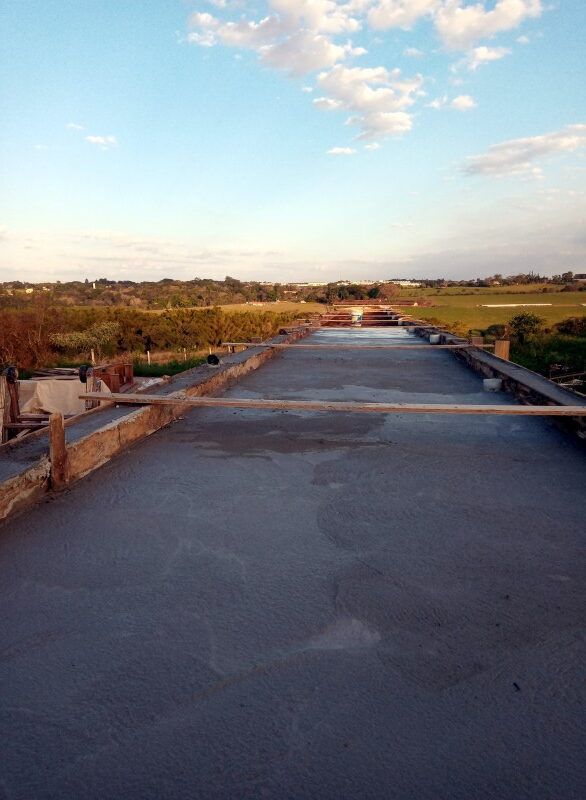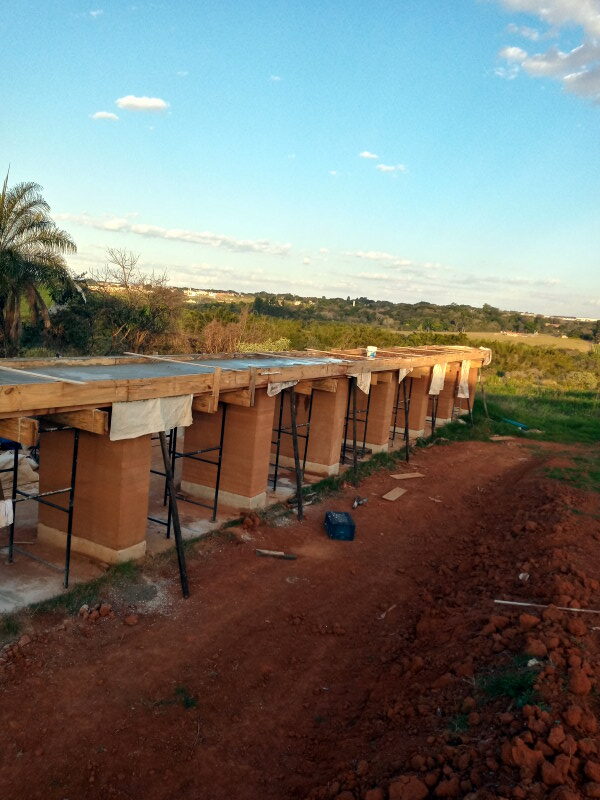 A expectativa era fazer tudo hoje. Só conseguimos metade. Fazer emenda numa laje dessas é ruim, mas foi o que deu pra fazer com os recursos que tínhamos à mão. Optei por deixar a emenda no meio do vão, porque se tiver infiltração de água, melhor no vão do que sobre as paredes de taipa. (Até porque as cargas do telhado estão sobre elas, e no meio do vão vai ser fácil reconhecer uma infiltração).