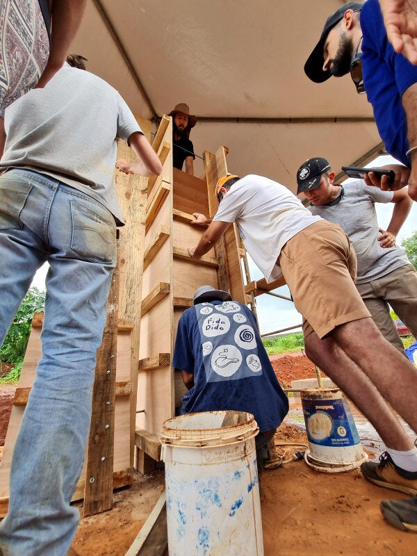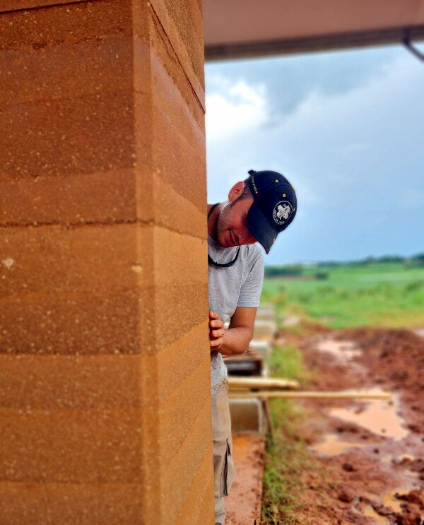 Se éramos eu, Antônio e Daniela no começo, depois de seis paredes, Jean começou a nos ajudar. Primeiro entendendo o processo de preparação da massa, até que uma hora ensinei-o a compactar a fiada dentro da forma.